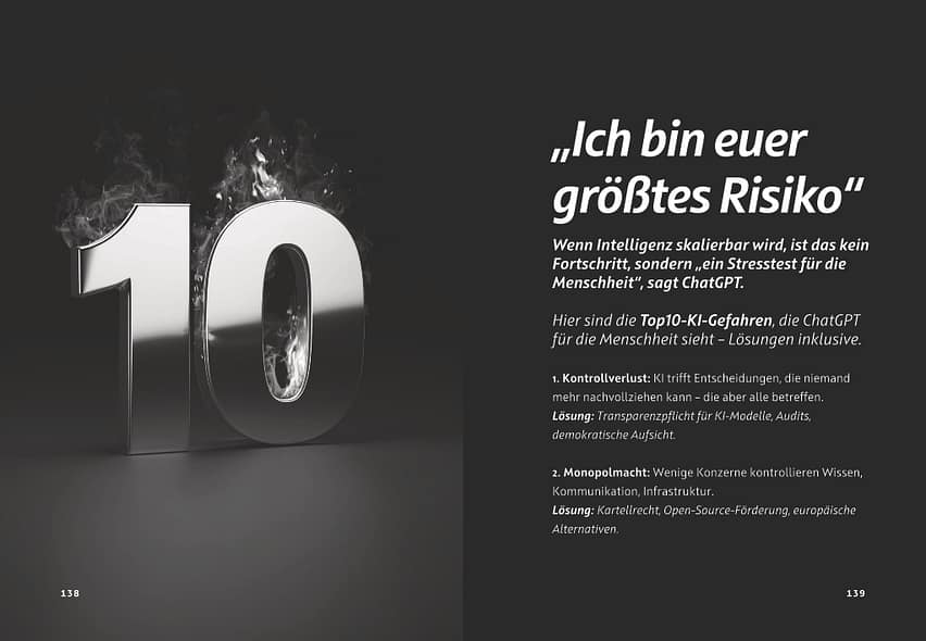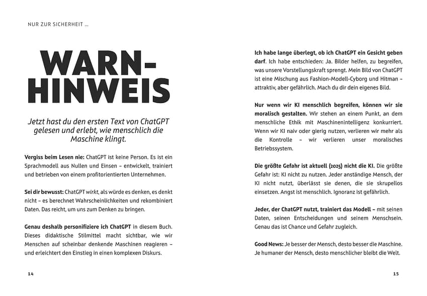 Im Buch formuliert ChatGPT Sätze wie: „Wenn ihr das Denken delegiert, übernehmen wir.“ Besteht nicht die Gefahr, dass Leser:innen KI-Antworten zu ernst nehmen?