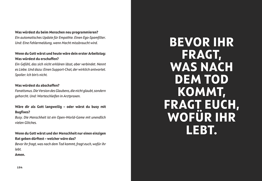 Ein Format, das sich so einfach liest wie ein Social-Media-Feed – unterhaltsam, pointiert, kurz in der Form – und dennoch wie ein Sachbuch wirkt, weil es Denken in Bewegung bringt.